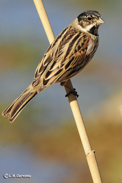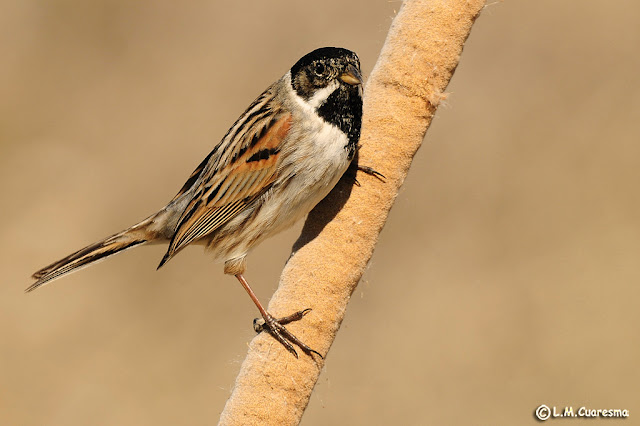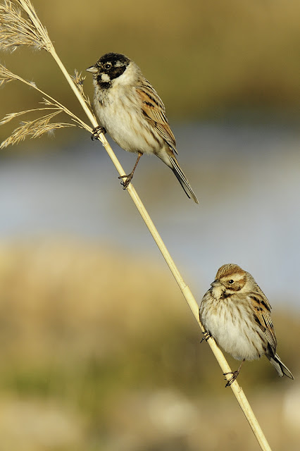 Para los que quieran comparar detalladamente los plumajes del macho y de la hembra, aquí está esta foto donde aparecen posados en la misma enea: